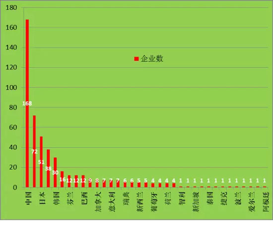 2015年“500強(qiáng)”上榜企業(yè)分別來自37個國家和地區(qū),比2014年“500強(qiáng)”多1個國家。其中,中國(中國大陸及香港、澳門、臺灣)有協(xié)鑫(集團(tuán))控股有限公司、晶龍實(shí)業(yè)集團(tuán)有限公司、國電科技環(huán)保集團(tuán)股份有限公司、龍源電力集團(tuán)股份有限公司、天能集團(tuán)、阿特斯陽光電力科技有限公司、新疆金風(fēng)科技股份有限公司等168家企業(yè)進(jìn)入“500強(qiáng)”榜單,比去年(163家)增加5家,占33.6%,居首位;美國有GE Energy、Archer Daniels Midland Company、Dow Corning Corporation、Valero Energy Corporation、Bunge Ltd.、POET LLC、First Solar Inc.、Sunpower Corporation、SunEdison Inc.等72家企業(yè)進(jìn)入“500強(qiáng)”榜單,比去年(74家)少2家,占14.4%,位居第二;日本則有Sanyo Electric Co., Ltd.、Sharp Corporation、Toshiba Corporation、Kyocera Corporation、Solar Frontier K.K.等51家企業(yè)進(jìn)入“500強(qiáng)”榜單,比去年(41家)多10家,占10.2%,排名超過德國升至第三;德國有Siemens AG、Enercon GmbH、E.ON Kraftwerke GmbH、Nordex SE、Juwi Holding AG等38家企業(yè)進(jìn)入“500強(qiáng)”榜單,比去年(48)少10家,占7.6%,退居第四;韓國有OCI Company Ltd.、LG Chem., Ltd. 、SK Group等30家企業(yè)進(jìn)入“500強(qiáng)”榜單,與去年(30家)持平,占5.8%,位居第五;西班牙則有16家,占3.2%,位居第六; 芬蘭、法國、巴西各12家,各占2.4%,并列第七;印度9家,占1.8%,位居第十(見圖1)。
