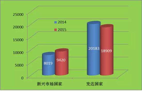 圖4 2014、2015“500強(qiáng)”發(fā)達(dá)國家與新興市場國家上榜企業(yè)總營業(yè)收入(單位:億元)