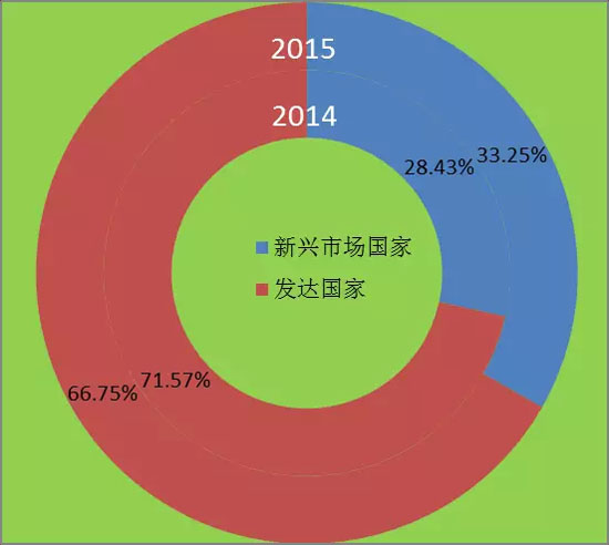 圖5 2014、2015“500強(qiáng)”發(fā)達(dá)國家與新興市場國家上榜企業(yè)總營收占比圖