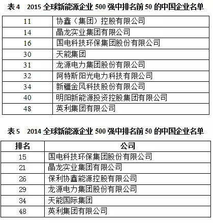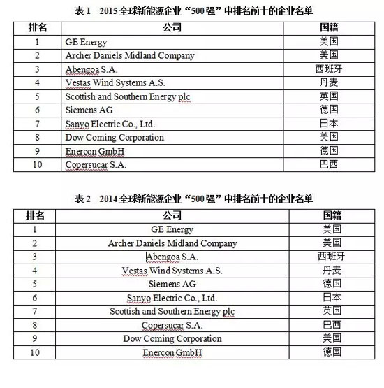 2015“500強(qiáng)”排名前十的企業(yè)依次為GE Energy(美國)、Archer Daniels Midland Company(美國)、Abengoa S.A.(西班牙)、Vestas Wind Systems A/S(丹麥)、Scottish and Southern Energy PLC(英國)、Siemens AG(德國)、Sanyo Electric Co., Ltd.(日本)、Dow Corning Corporation(美國)、Enercon GmbH(德國)和Copersucar S.A.(巴西)。連續(xù)2年,前十的企業(yè)中都出現(xiàn)了新興市場國家企業(yè)的身影,而不再是由發(fā)達(dá)國家企業(yè)獨(dú)霸。由此可見,新興市場國家企業(yè)的競爭力增強(qiáng),其與發(fā)達(dá)國家的差距正減少。