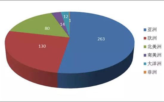 2015“500強(qiáng)”企業(yè)地域分布格局與2014 “500強(qiáng)”基本一致,主要分布在3大洲(見圖6):亞洲、歐洲和北美洲;其中,亞洲共有263家企業(yè)入圍榜單,比2014年的245家增加18家,占52.6%,依舊位居首位;歐洲共有130家企業(yè)入圍榜單,比2014年的141家減少11家,占26%,位居第二;北美洲共有80家企業(yè)入圍榜單,比2014年的81家減少1家,占16%,位居第三;南美洲14家企業(yè)進(jìn)入榜單,而大洋洲12家企業(yè)進(jìn)入榜單;剩余的1家企業(yè)則來自非洲。