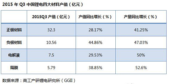 據(jù)高工產(chǎn)研鋰電研究所(GGII)調(diào)研數(shù)據(jù)顯示,2015年第三季度中國(guó)鋰電池材料產(chǎn)值規(guī)模達(dá)56.15億元,同比增長(zhǎng)32.5%,環(huán)比增長(zhǎng)18%。