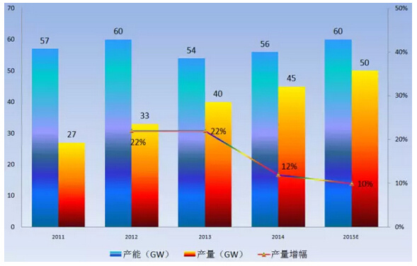 美國SPV Market Research預測,2015年,全球太陽能光伏組件的出貨量將達到49.7GW,相比2014年增長約25%;全球太陽能光伏組件產量將達到50GW,同比增長約10%;全球太陽能光伏組件的產能可以達到60GW,同比增長約7%。