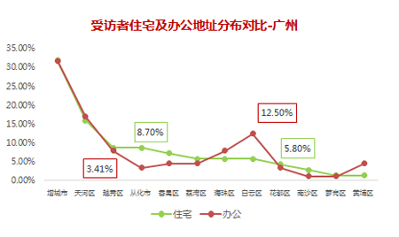 廣州受訪者范圍覆蓋了12個(gè)城區(qū),其中增城市、天河區(qū)、的受訪者人數(shù)最多。