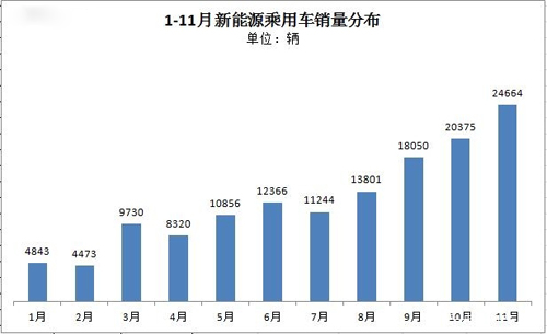 據乘聯會數據統計,新能源乘用車銷量繼10月突破2萬后,11月創新高,銷量持續攀升至24664輛,同比增長2.4倍,凈增長4289輛。前11月新能源乘用車累計銷量已達13.87萬輛。從1-11月銷量分布看,今年新能源乘用車銷量表現強勁增勢,從5月銷量首次破萬后繼續攀升,在7月出現小幅回落,而后8-11月連續4個月表現較大幅度增長。