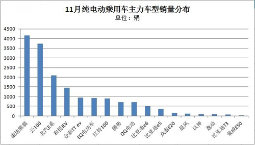 其中,本月純電動車型銷售達到17065輛,同比增長231%;插電混合動力車型銷量達到7599輛,同比增長262%;從分布看,純電動車型依舊占據較大優勢,本月占比達69%,而插電式車型占比31%。1-11月累計銷量,純電動車型達8.5萬輛,插電式車型達5.4萬輛。雖然插電混動總量表現弱于純電動轎車,但其今年增速表現相對較快(從5月開始至9月銷量連續攀升,經過10月小幅下降,在本月創下新高。)。純電動車型銷量走勢則類似于乘用車總體銷量趨勢,從8月至今表現較強增勢。