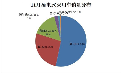插電式乘用車領域,比亞迪依舊一家獨大,旗下秦和唐占據插電式車型總銷量的80%,兩車型銷量達6070輛。比亞迪唐的銷量在本月突破4千輛,占比達53%,繼續拉大與秦的銷量差距,成為插電式乘用車領域的領軍車型。比亞迪秦則保持2000輛左右水平,占比27%。此外,榮威550車型本月銷量呈現大幅增勢,銷量達1207輛,環比增長2.4倍。在插電式乘用車市場占比也由上月6%提升至本月的16%。從其銷量走勢看,榮威550車型銷量從7月超過千輛后,僅在10月銷量大幅下滑至356輛,而后在本月回升至千輛水平。