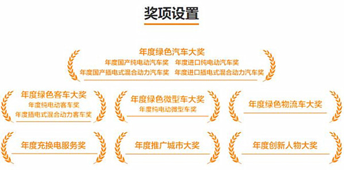 本次評選活動共設(shè)置七大類別14個細(xì)分獎項(xiàng),分別是:年度綠色汽車大獎、年度國產(chǎn)純電動汽車獎、年度國產(chǎn)插電式混合動力汽車獎、年度進(jìn)口純電動汽車獎、年度進(jìn)口插電式混合動力汽車獎、年度綠色客車大獎、年度純電動客車獎、年度插電式混合動力客車獎、年度綠色微型車大獎、年度純電動微型車獎、年度電動物流車獎、年度創(chuàng)新人物獎、年度充電服務(wù)創(chuàng)新獎、年度推廣城市大獎。