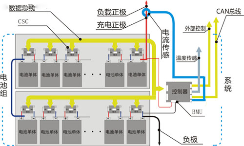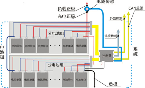 和分布式的看起來類似,這種系統由單體模塊(UM)、總線和控制器三部分構成。模塊為4端口,安裝在每串電池上,2個輸入端與電池正負極連接,2個輸出端連接在總線上。總線是2線制,每套總線可以連接一定數量的模塊。所有的模塊都并聯在總線上,數據和均衡的能量都通過總線與每串電池傳遞。因為象搭積木一樣,多個系統可以通過CAN總線連接構建成更大規模(百串級別)的電池組能量管理系統,積木式架構由此得名。