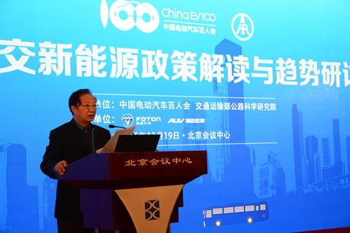 2015年12月19日,由中國電動汽車百人會與交通運輸部公路科學研究院聯合舉辦的“城市公交新能源政策解讀與趨勢研討會”在北京召開,國務院發展研究中心原黨組書記陳清泰、交通運輸部運輸服務司副司長王水平、工業和信息化部裝備工業司副巡視員瞿國春、中國道路運輸協會城市客運分會理事長張國光、中國電動汽車百人會執行副理事長歐陽明高等參加會議并講話。