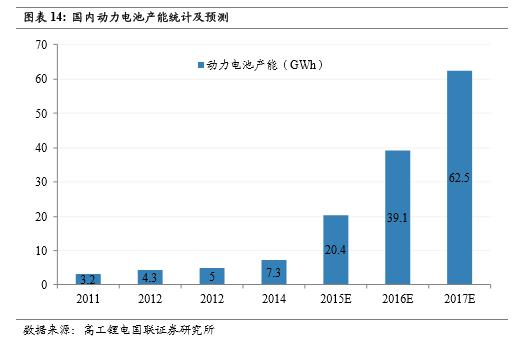 國聯證券預計,未來三年國內動力電池產能將達到60GWh,16、17年均新增產能有望達到 20GWh。