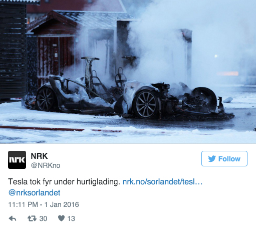 據(jù)外媒Fædrelandsvennen 的報(bào)道,周五早上一輛特斯拉Model S在超級(jí)充電站充電時(shí)突然起火。所幸事故發(fā)生后沒(méi)有人員傷亡。