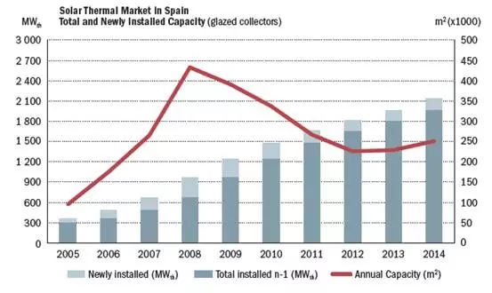 在連續四年的市場衰退之后,西班牙光熱市場終于進入了穩定發展期。2014年底,西班牙集中式光熱發電裝機共計2.24 GWth,全年平均增速9%。