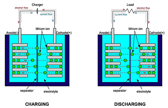 上圖非常好地顯示了電池充放電時(shí)的過(guò)程。這里先只說(shuō)放電:電池內(nèi)部,金屬鋰在負(fù)極失去電子被氧化,成為鋰離子,通過(guò)電解質(zhì)向正極轉(zhuǎn)移;正極材料得到電子被還原,被正極過(guò)來(lái)的鋰離子中和。電解質(zhì)的理想作用,是運(yùn)送且僅運(yùn)送鋰離子。電池外部,電子從負(fù)極通過(guò)外界電路轉(zhuǎn)移到正極,中間進(jìn)行做功。理想情況下,電解質(zhì)應(yīng)該是好的鋰離子的載體,但絕不能是好的電子載體。因此在沒有外界電路時(shí),電子無(wú)法在電池內(nèi)部從負(fù)極轉(zhuǎn)移到正極;只有存在外界電路時(shí),電子轉(zhuǎn)移才能進(jìn)行。