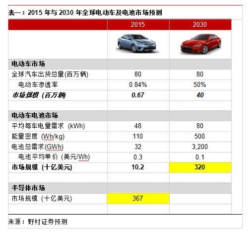 [摘要]我們假設全球電動汽車的電池市場普及率能達到50%,估計電動車動力電池市場規模將在2030年達到3200億-4000億美元,幾乎與目前全球半導體市場營收持平。