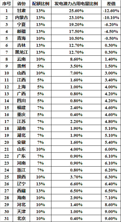 然而,哪些省份是買方?哪些省份是賣方?下表為“國家給各省的可再生能源配額”、“在不限電的情況下,各省風電、光伏可能的發(fā)電量占用電量的比例”以及兩者之間的差額。