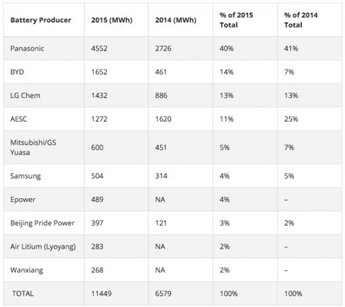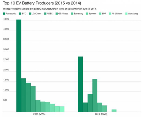 三星排在第六位,2015年銷量504兆瓦時(shí),其合作伙伴包括寶馬與菲亞特。排在第七位至第十位的分別是Epower、北京普萊德、中航鋰以及萬向,他們都是來自中國(guó)的企業(yè)。