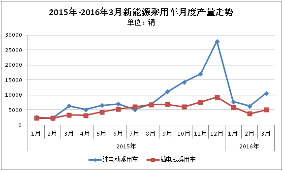 2016年新能源乘用車銷量受開年淡季的影響,經(jīng)過前兩月的連續(xù)下滑,在3月開始出現(xiàn)上漲趨勢(shì)。據(jù)乘聯(lián)會(huì)數(shù)據(jù)統(tǒng)計(jì),2016年3月新能源乘用車銷量達(dá)1.56萬輛,環(huán)比增長(zhǎng)55%,與去年同期相比增長(zhǎng)60%。截至目前,第一季度累計(jì)銷量已達(dá)3.95萬輛,同比增長(zhǎng)超過1倍,實(shí)現(xiàn)月均1.3萬輛左右的銷量水平。