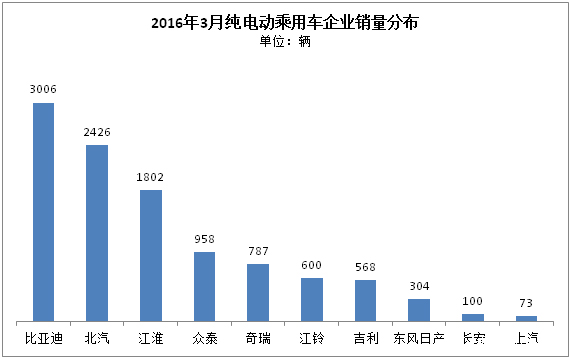 分車企看, 10家純電動(dòng)乘用車企業(yè)排行中,比亞迪以3006輛的水平居于首位,而北汽則由2月排名首位滑至本月第2名,而江淮繼續(xù)維持第三名的地位。值得指出的是,雖然排名有所改變,但總體看,細(xì)分到3月各家車企銷量都有不同程度的提升。其中,3月銷量過千輛的車企依舊是前三名,比亞迪、北汽、江淮三家企業(yè)累計(jì)銷量達(dá)7234輛,占純電動(dòng)乘用車總銷量的69%。而銷量過百輛的企業(yè)也達(dá)9家,較之2月有大幅提升。